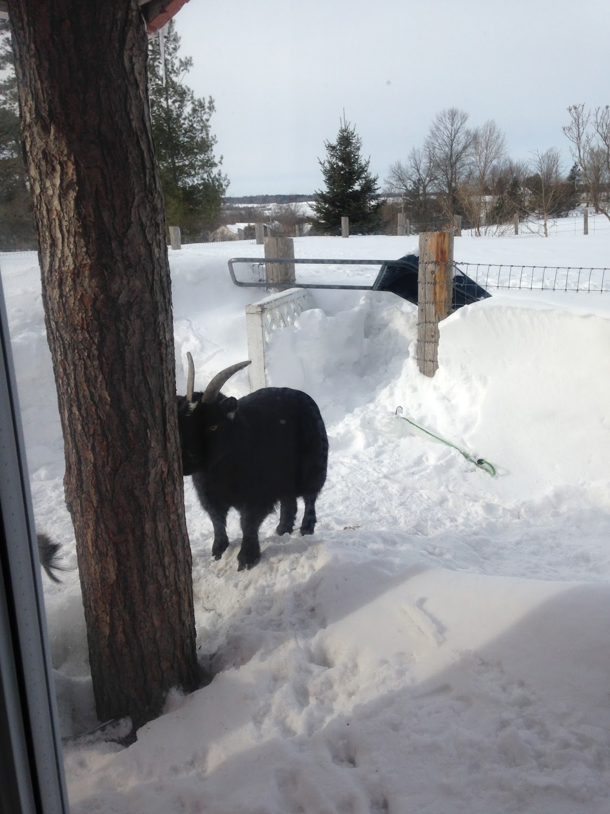 Almost April and the snow is still high ,and our driveway is still an ice rink ..I would like to throw my hands up in the air and lament to Mother nature that I give up! The tranquil serenity of country life has been blemished by relentless winds,snow and biting temperatures. our outdoor animals have spent far too much time huddled inside ,and even with heat lamps and straw i have fretted for their comfort on minus thirty five degree nights! frozen doors, and water pails ..frozen taps and pipes..it has made us wonder if we can do this again! yet today the sun is out. Today i am sending thaw vibes out to make it all go away. i will promise to welcome the clean up of muck,debris and whatever else landed deep in the snow over the past five months and embrace the feeling of soil once more instead of white crunchy stuff.!